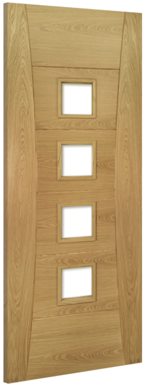 This unique door showcases the gorgeous crown-cut veneer of American white oak (Quercus Alba). Contrasting orientation shows off the grain pattern to its best advantage, and the contrast is strikingly accentuated by the gentle curves of the vertical veneers, which carve a subtle waist into the horizontals. In the glazed door, four square panes of clear, toughened glass are set neatly into the veneer panels.
