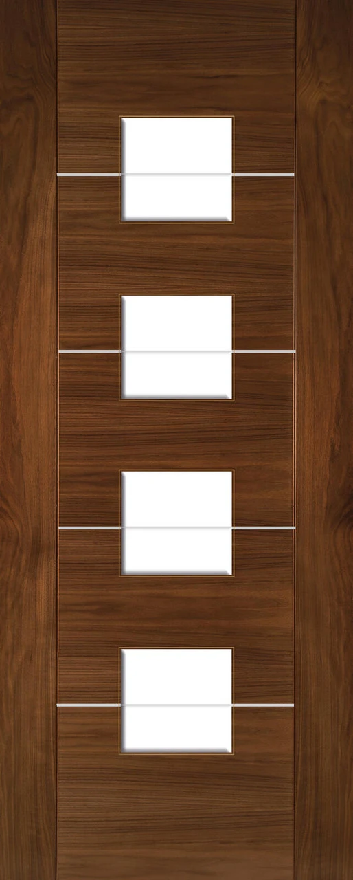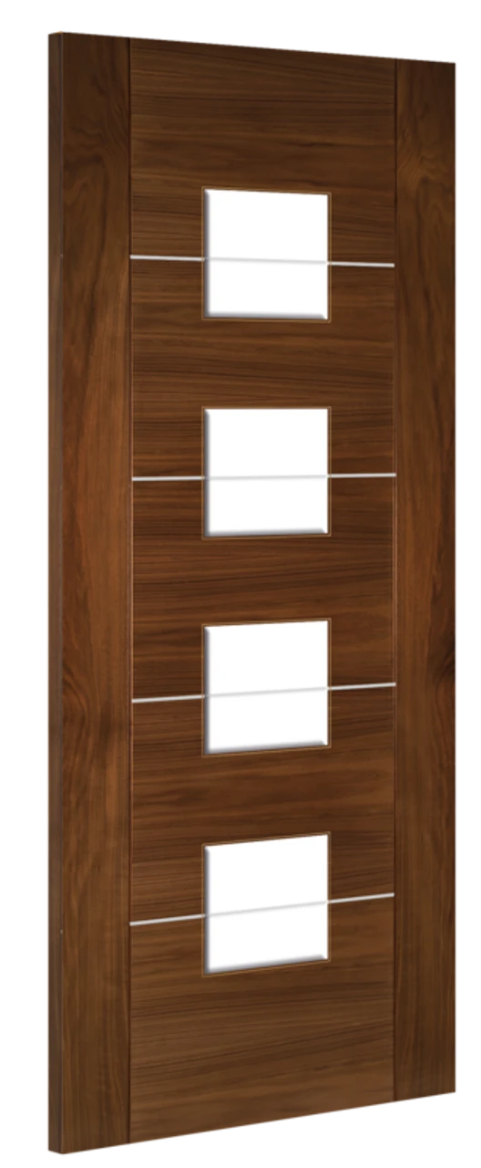 This contemporary-style door refuses to blend into the background. Horizontal panels of American black walnut veneer, showing off a bold woodgrain pattern, are accentuated by crisp aluminium inlays. The glazed door features a series of vertically aligned, v-groove glass panes that neatly interrupt the aluminium inlays. The bold and beautiful prefinished Valencia Walnut door will stand out in any home.