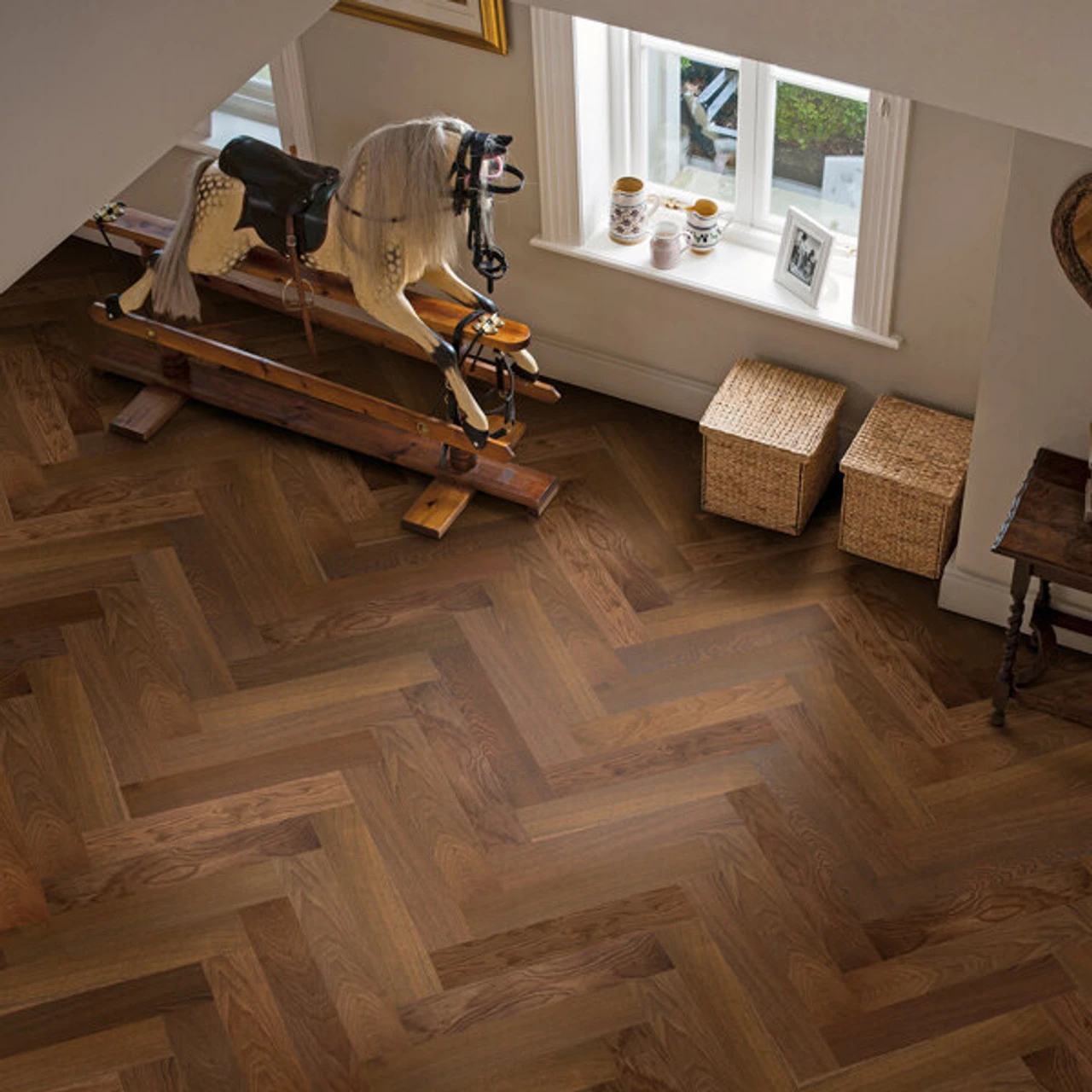 Herringbone, or “V” shaped, is a very popular pattern for engineered wood flooring. This style is made up of 14mm wide planks, with a 3 mm wear layer on top and a 25 Year guarantee. It is suitable for use in all areas of the home except those with high humidity levels. Herringbone refers to the distinctive pattern that the floor is laid in and this in turn allows you to create your own unique style. The flooring has a 3mm wear layer to sand and refinish as necessary. Compatible with underfloor heating, the floor can be used is all areas of the home, except any that experience high levels of humidity