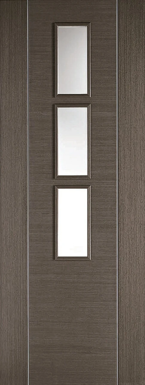 Three clear glazed panels are framed by decorative vertical bars and a pre-finished Chocolate Grey wood grain.