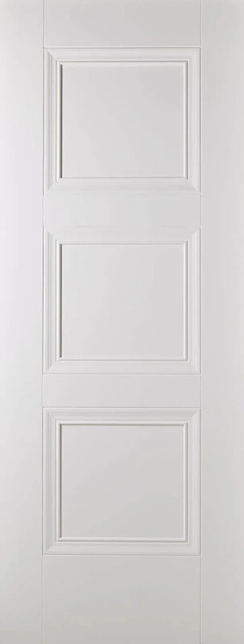 This white primed door features three equal sized panels, framed by decorative beading, forming a stylish finish.