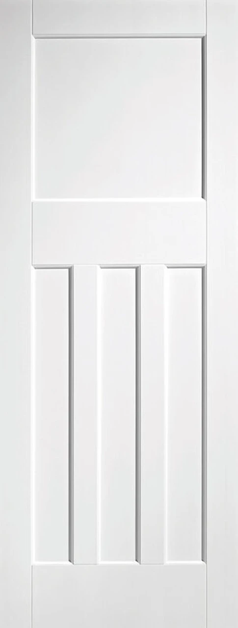 This 30’s style door is made from a primed solid core in white and features three rectangular inset panels below a larger square panel.
