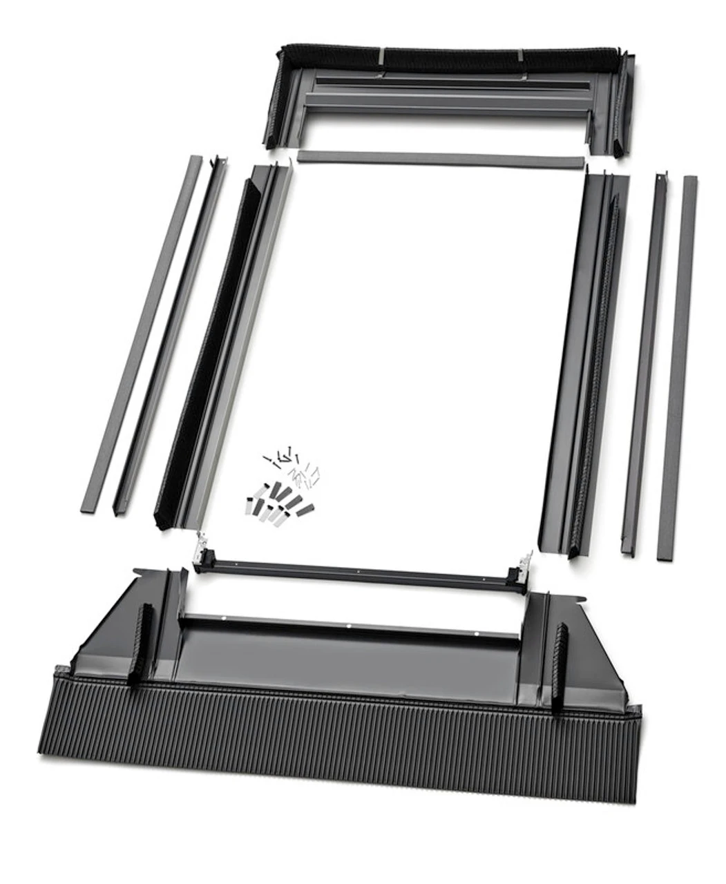 The Pro+ (2000) flashing set from Velux comes with underfelt collar (BFX) for a watertight seal between the roof window and the roof and insulation collar (BDX) for reduction of heat loss and eliminating cold bridges. Recessed flashings provide a sleek and streamlined finish as the roof window is installed 40 mm deeper into the roof structure, meaning that less of the roof window protrudes above the roofline. For recessed installation heights, install the brackets at the sides of the frame at the blue line level. This product comes in a range of sizes, check the features section for the size guide.