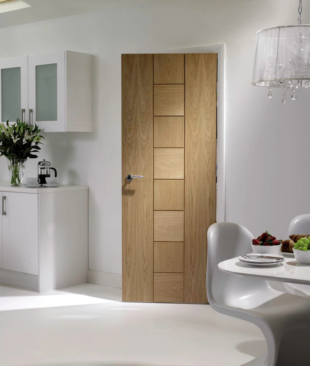 A contemporary unfinished oak door combining horizontal and vertical grain panels. The Messina oak door has a fresh modern style combining horizontal and vertical grain panels. Once finished this door will act as a real centrepiece to any home. The Messina oak door range includes matching glazed and fire doors.