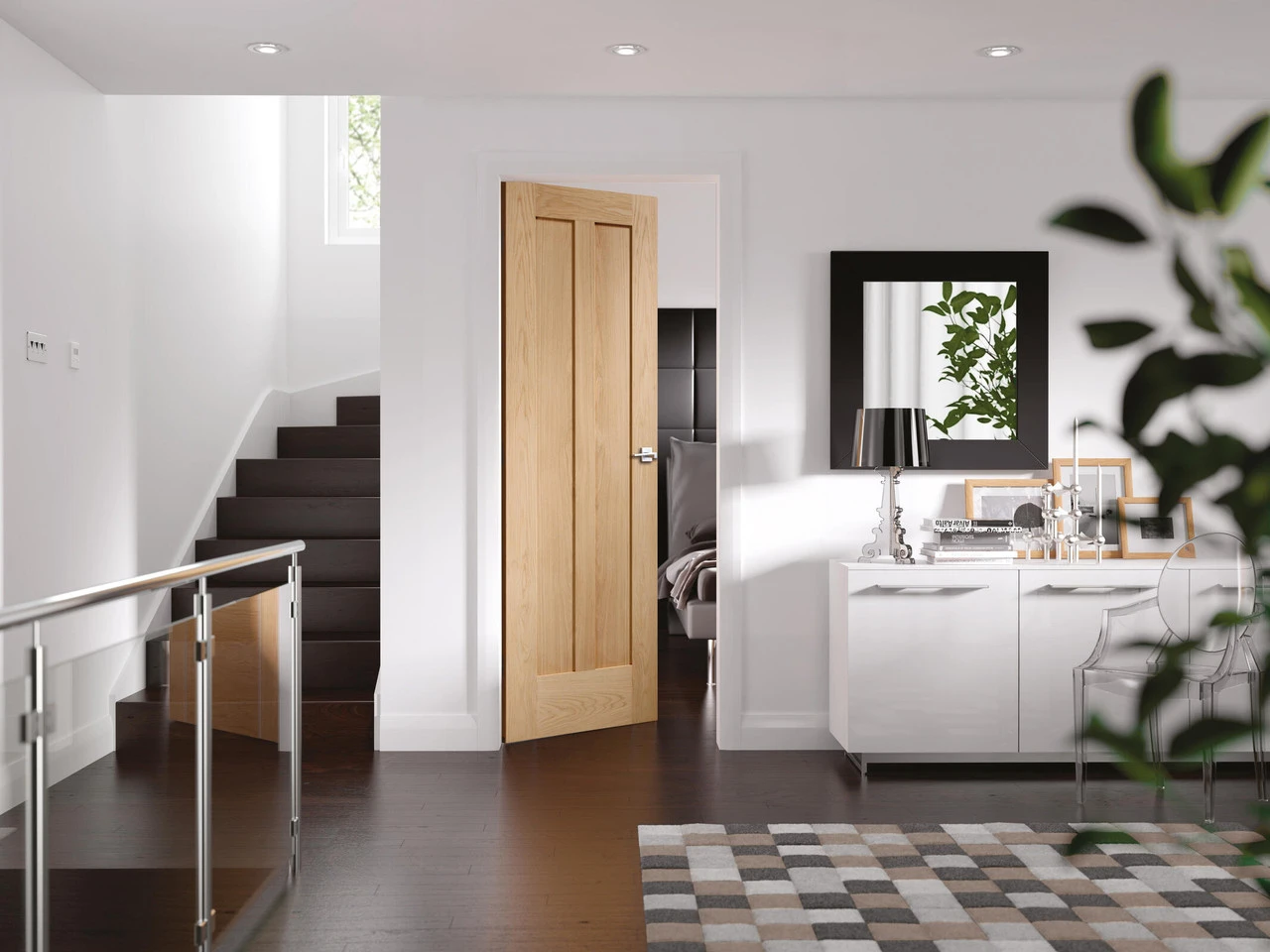 A stylish two panelled unfinished oak door. A simplistic yet stylish two panelled door the Novara forms part of our Metropolitan range. The contemporary two panel door design has flat recessed panels that really accentuate the natural timber. The contemporary door design is also available with clear glazed and fire door versions allowing for a consistent look to be created throughout the home.