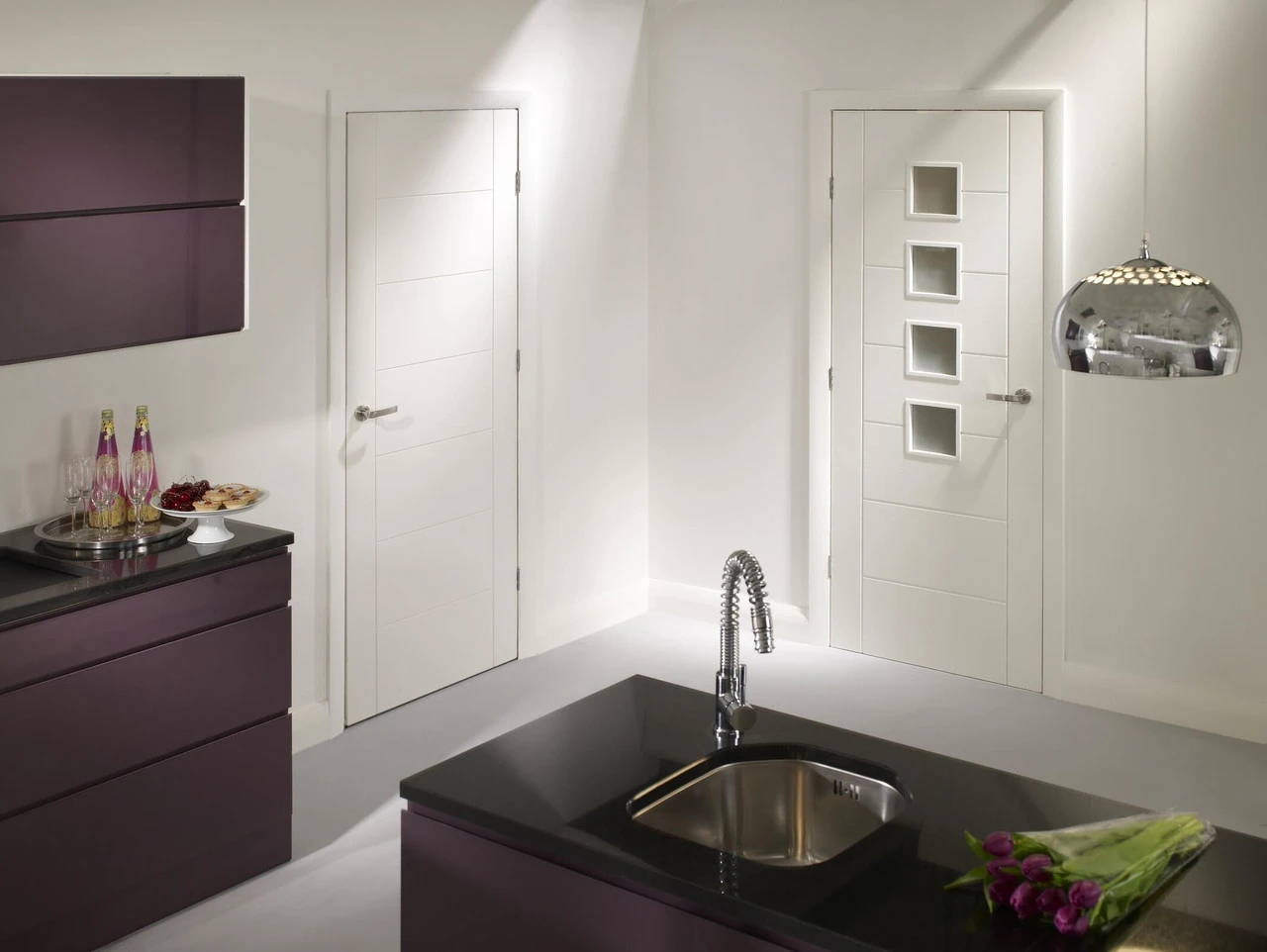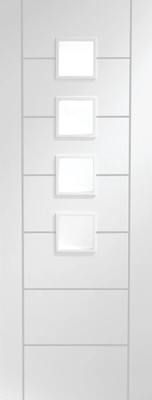 A contemporary 7 panel fully finished oak door with clear glass. A fully finished 7 panel door with 4 obscure glazed panels located in the central section of the door. The obscure glass allows for privacy to be maintained whilst also allowing a degree of natural light to flow between two rooms. This family of doors also comes with a panelled and fire door versions.