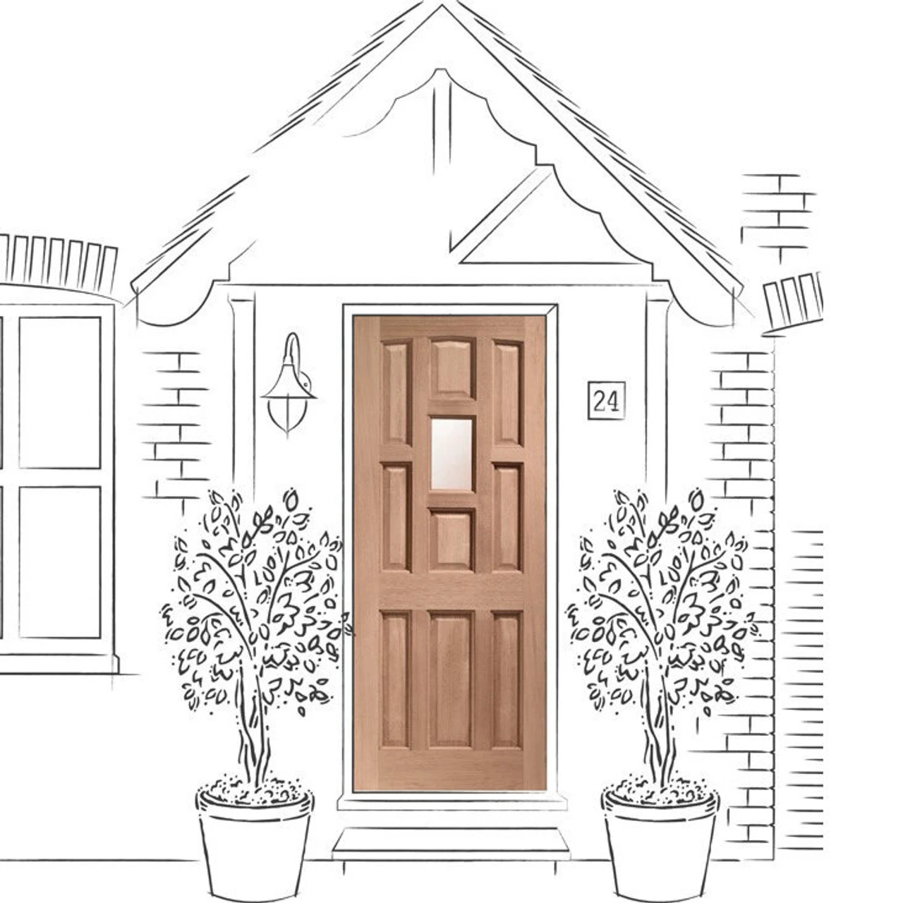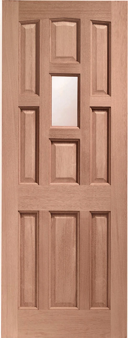 A traditional style unfinished single glazed dowelled hardwood door with obscure glass. The York Hardwood door has a traditional single clear glazed pane of glass surrounded by nine raised and fielded feature panels for an added effect. This stylish and bold panelled door will create real kerb appeal. A door that will add a touch of elegance to any property.